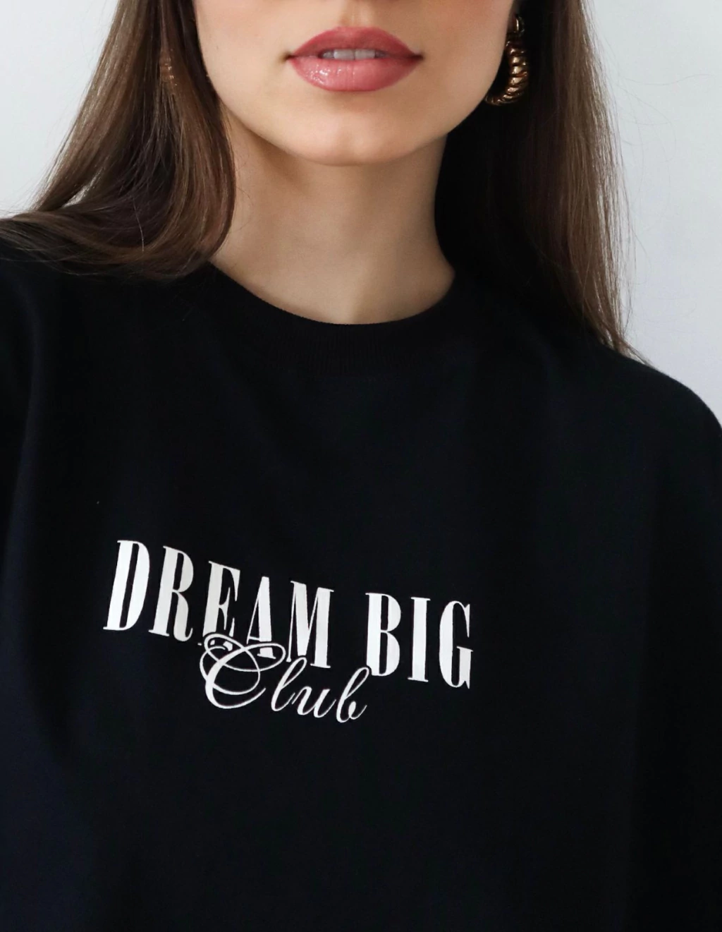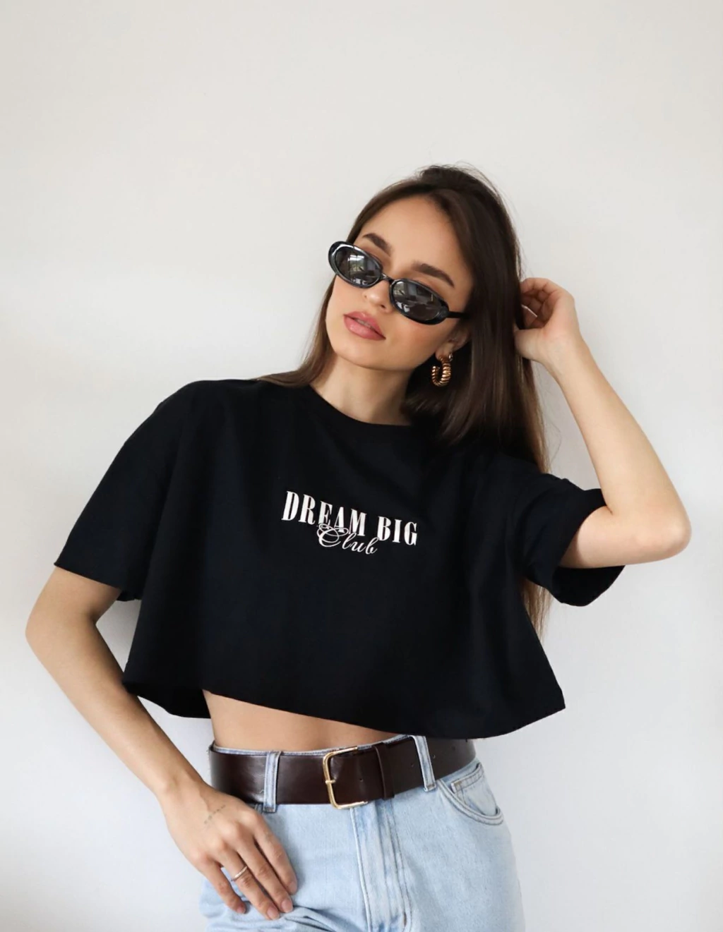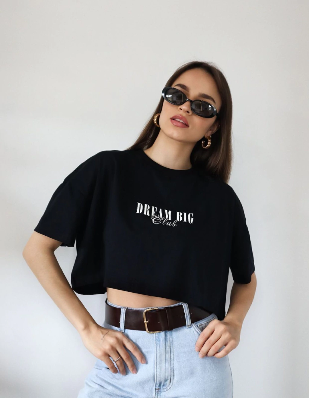 O cropped dream big possui modelagem oversized com costura de ombro deslocada, que resulta em uma proposta mais larga. Produzido em malha 100% algodão, proporcionando conforto, respirabilidade e toque macio. Cropped preto, estampado em silk na cor off white. A frase "Dream Big Club" faz um referência a "Clube dos que sonham grande".